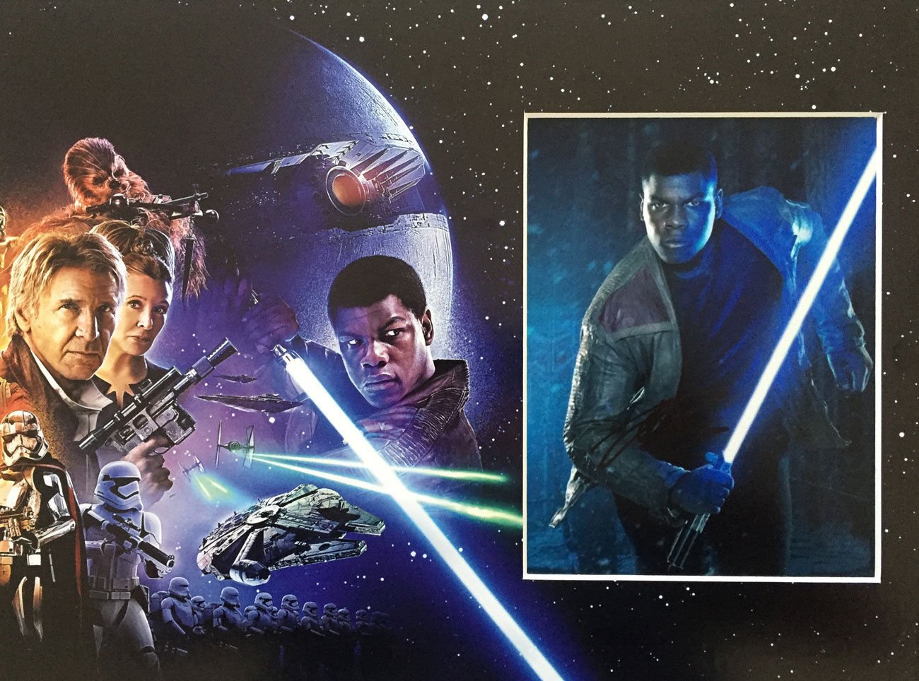 Here we have a personally HAND SIGNED 7x5 photo by John Boyega which has been professionally mounted into a 16x12 photo from Star Wars: The Force Awakens.