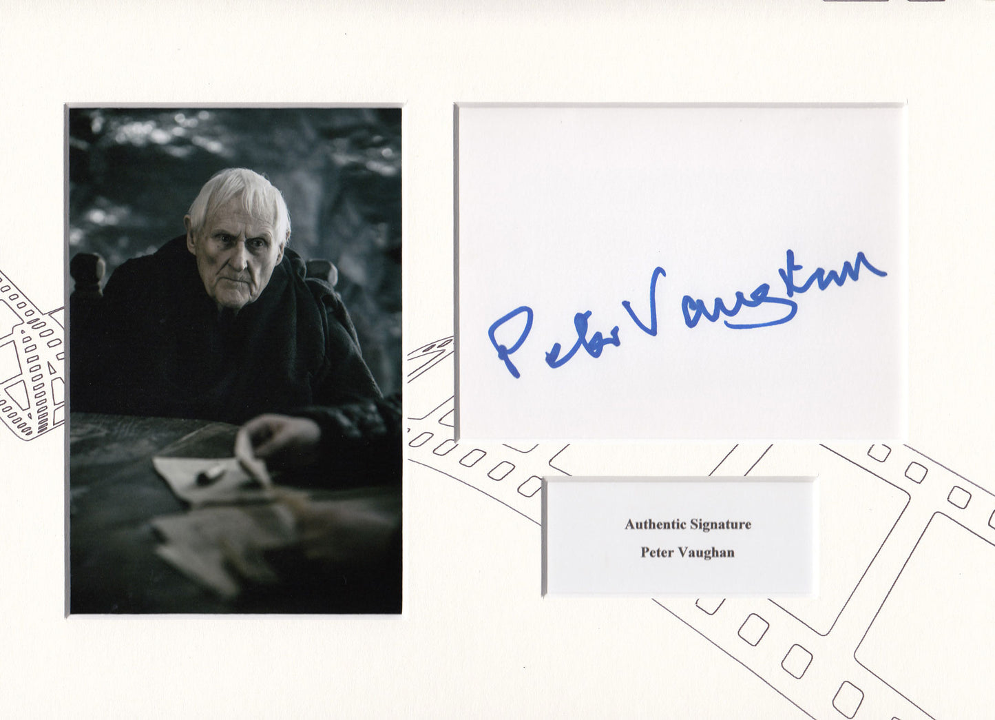 Here we have a personally HAND SIGNED index card by the actor Peter Vaughan, which has been professionally mounted into a A4 size photo display.